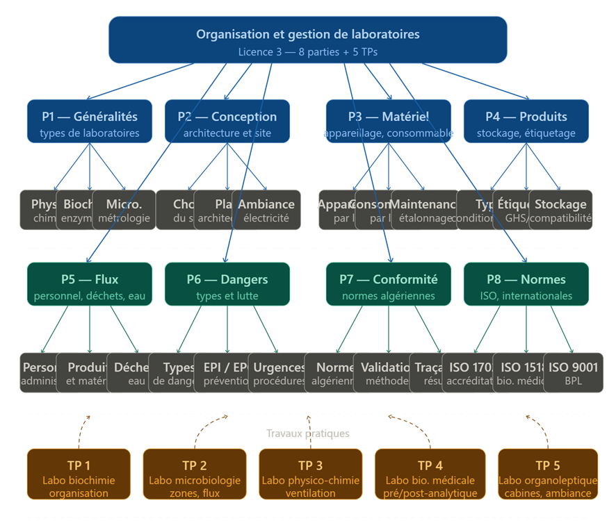 La maîtrise de l'organisation et de la gestion des laboratoires est une compétence fondamentale pour tout professionnel des sciences de la nature et de la vie (SNV). Elle conditionne la qualité des résultats analytiques, la sécurité des personnels et la conformité aux normes nationales et internationales (ISO, OMS, ALGERAC).
