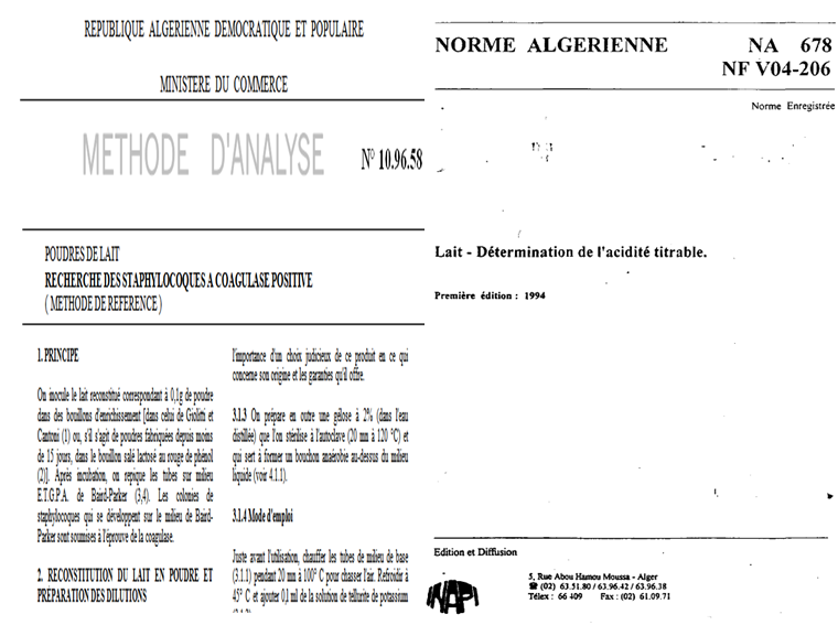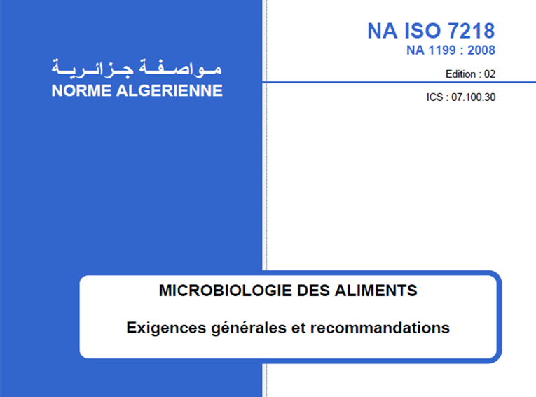 NA ISO 7218 : Institut algérien de normalisation (2008). Microbiologie des aliments — Exigences générales et recommandations pour les examens microbiologiques. Organisation internationale de normalisation (ISO), Genève.