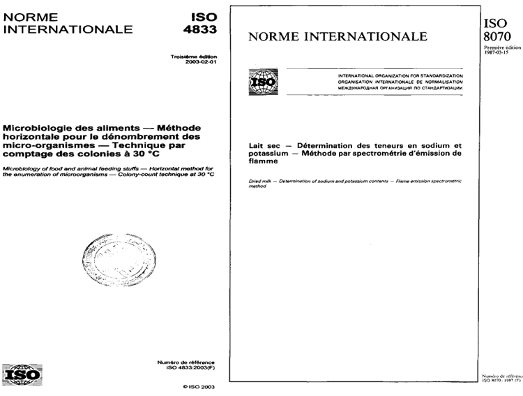 ISO 4833. Microbiologie de la chaîne alimentaire – Méthode horizontale pour le dénombrement des microorganismes – Technique par comptage de colonies.