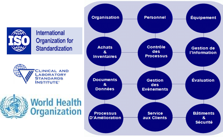 L'OMS (Organisation Mondiale de la Santé) a publié le « Système de gestion de la qualité au laboratoire — Manuel » (OMS, Genève, 2013), qui constitue le cadre de référence pour les laboratoires de santé dans les pays en développement. Il est organisé autour de 12 éléments de qualité :