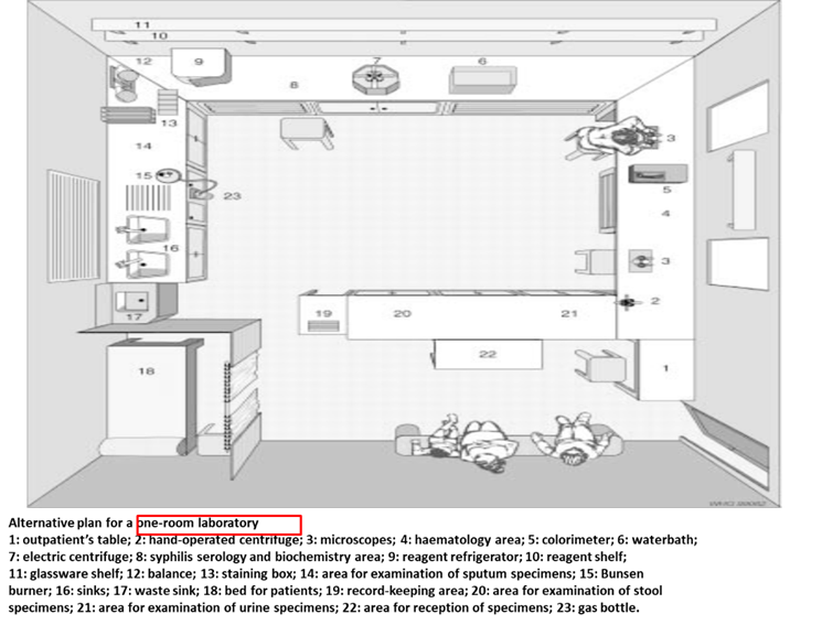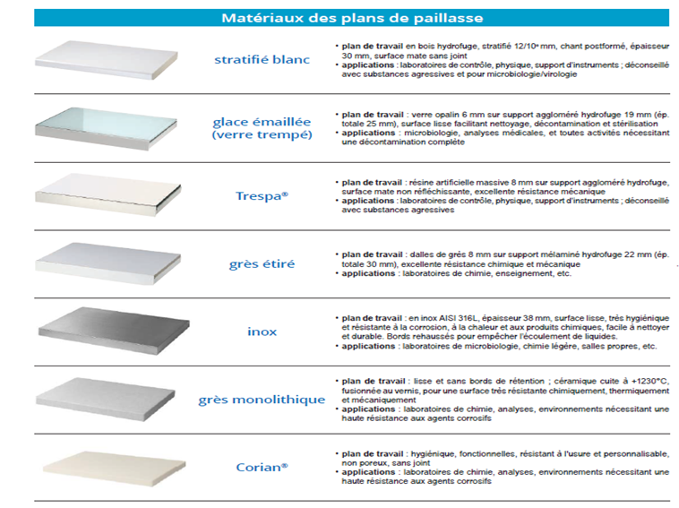 – Plan architectural : superficie, plan de répartition des salles, conception des sols, conception des murs (isolation), conception des paillasses, conditionnement électrique, conditions d’ambiance.