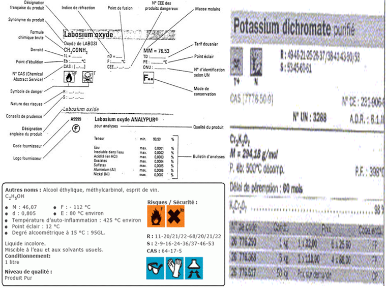 – Produits de laboratoire : type de produits, conditionnement, étiquetages, endroit de stockage.